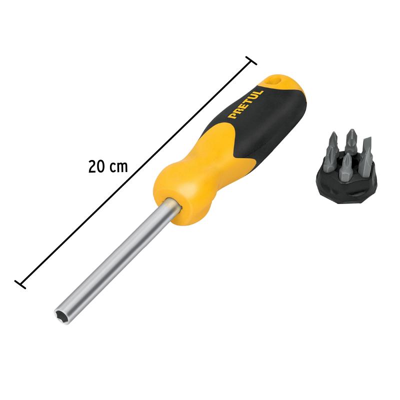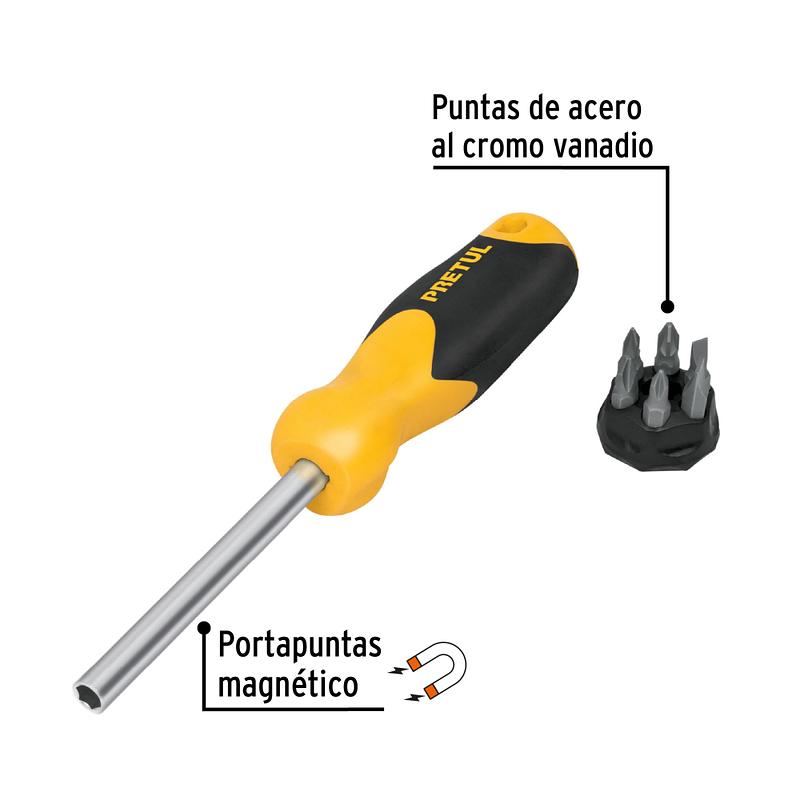 Desarmador tipo matraca con mango ergonómico y 6 puntas intercambiables de alta resistencia. Ideal para trabajos de mantenimiento, reparaciones domésticas y tareas técnicas. Compacto, funcional y fácil de transportar.