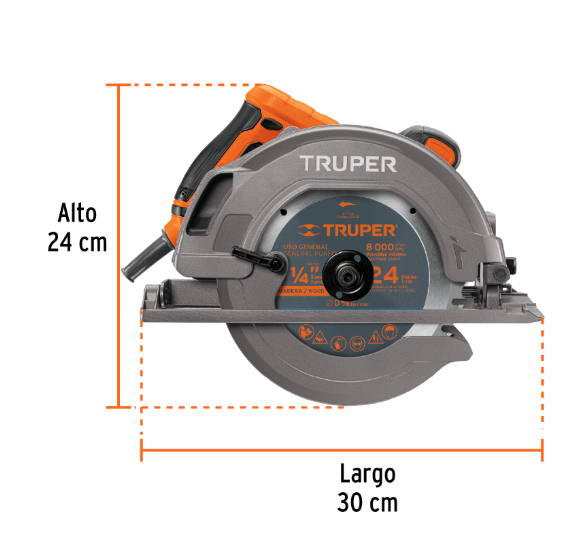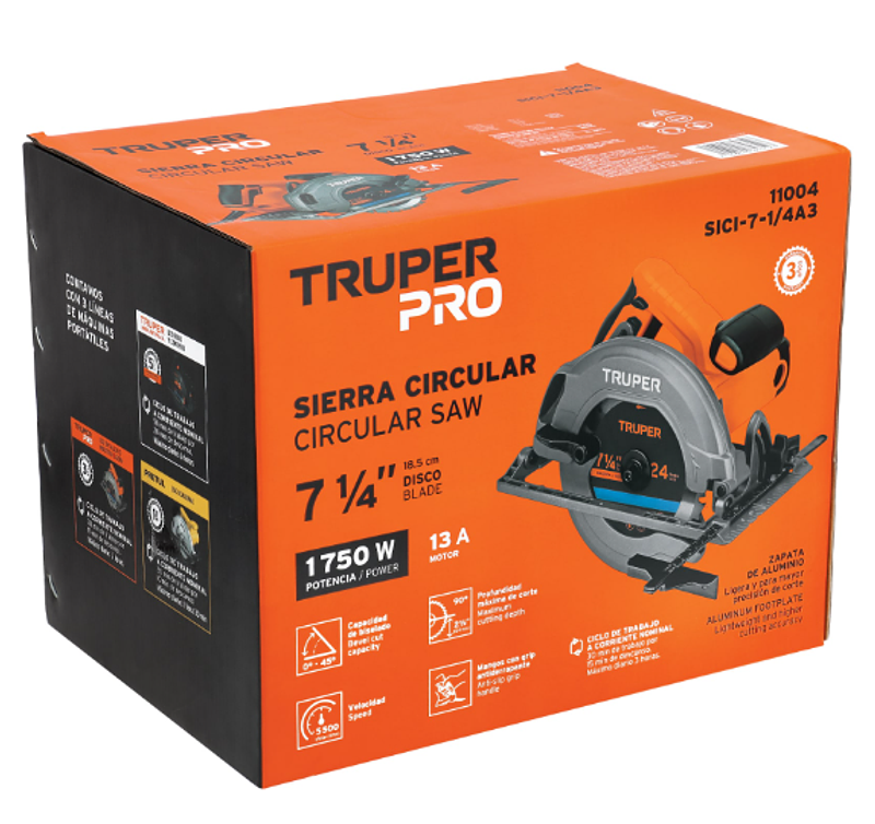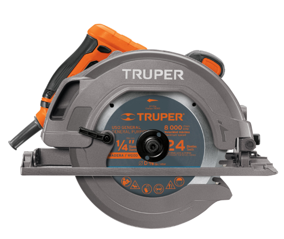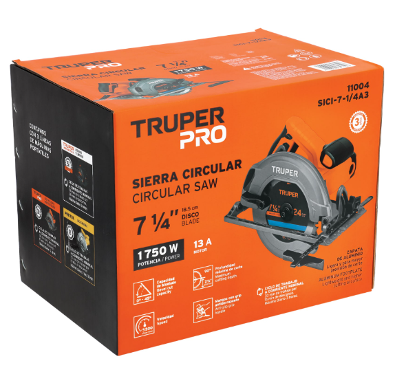 Sierra circular TRUPER PRO de 7-1/4” y 1750W, diseñada para cortes rectos, precisos y potentes en madera y materiales derivados. Ideal para uso profesional gracias a su alto rendimiento, durabilidad y diseño ergonómico.
