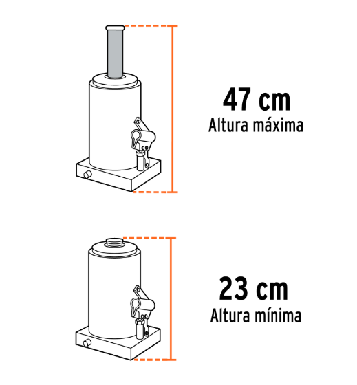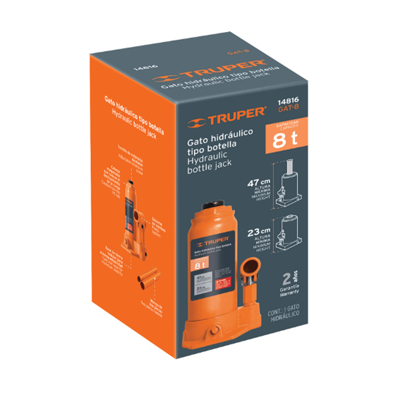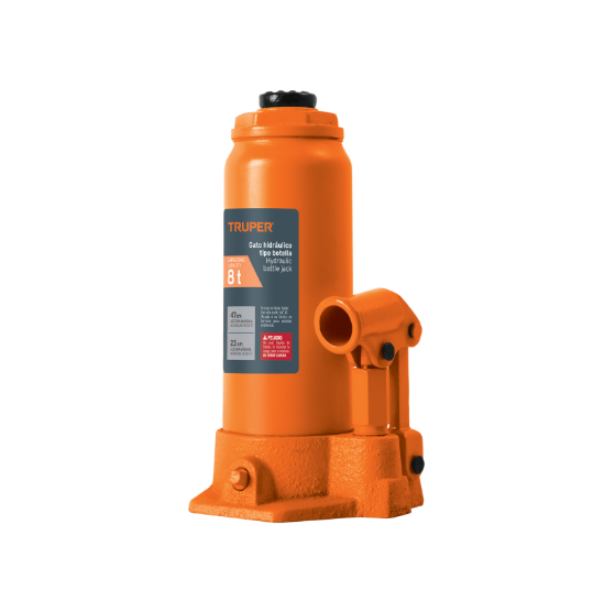 Gato hidráulico Truper tipo botella de 8 toneladas, diseñado para levantar vehículos y cargas pesadas de forma segura y eficiente. Ideal para uso automotriz, talleres mecánicos y trabajos industriales gracias a su gran capacidad y estructura resistente.