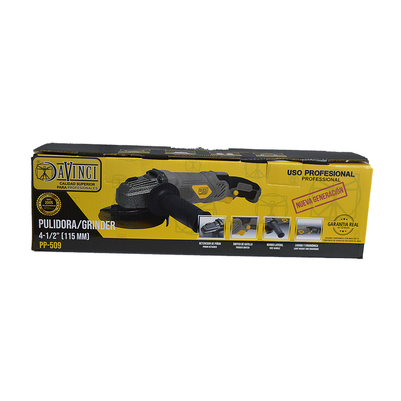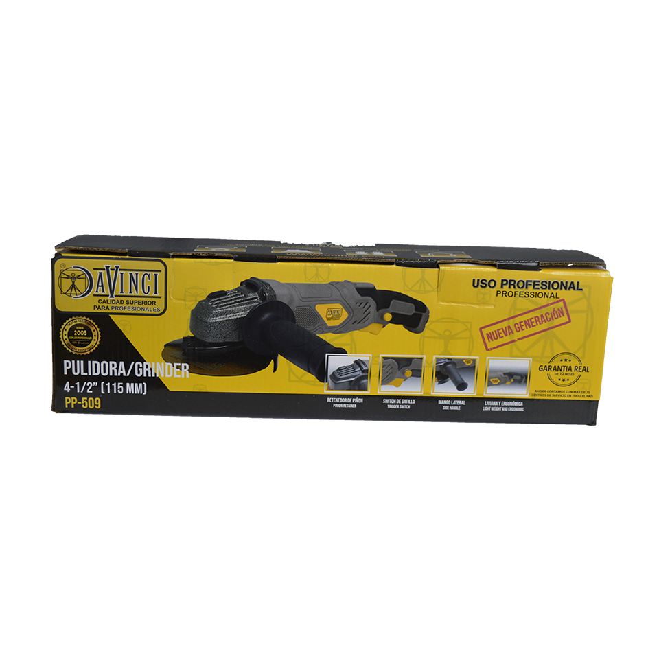 Pulidora DaVinci profesional de 4-1/2” y 900 W, diseñada para trabajos pesados de corte, desbaste y pulido en metal y otros materiales. Su motor potente y estructura robusta la hacen ideal para uso continuo en talleres y obras.