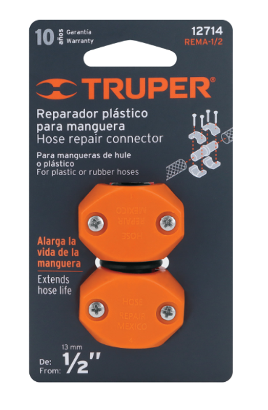Reparador 1/2” fabricado en ABS para manguera, marca Truper, ideal para unir o reparar tramos dañados de manguera de forma rápida y segura, sin necesidad de herramientas especializadas.