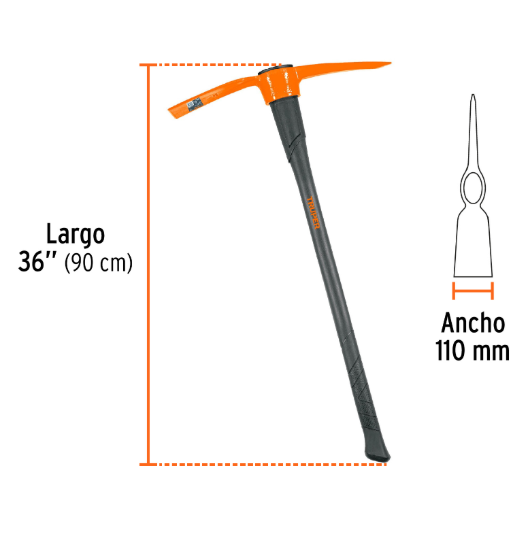 - Ideal para excavar en suelo duro con su punta talacho, y para romper superficies rocosas como grava y tierra seca endurecida con su punta pico.