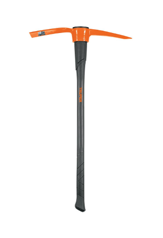 Talacho-pico Truper de 5 lb con mango de fibra de vidrio de 36”, ideal para trabajos de excavación, remoción de tierra, piedras y raíces. Ofrece alta resistencia, durabilidad y un agarre cómodo que reduce la vibración durante el uso.