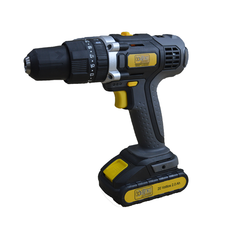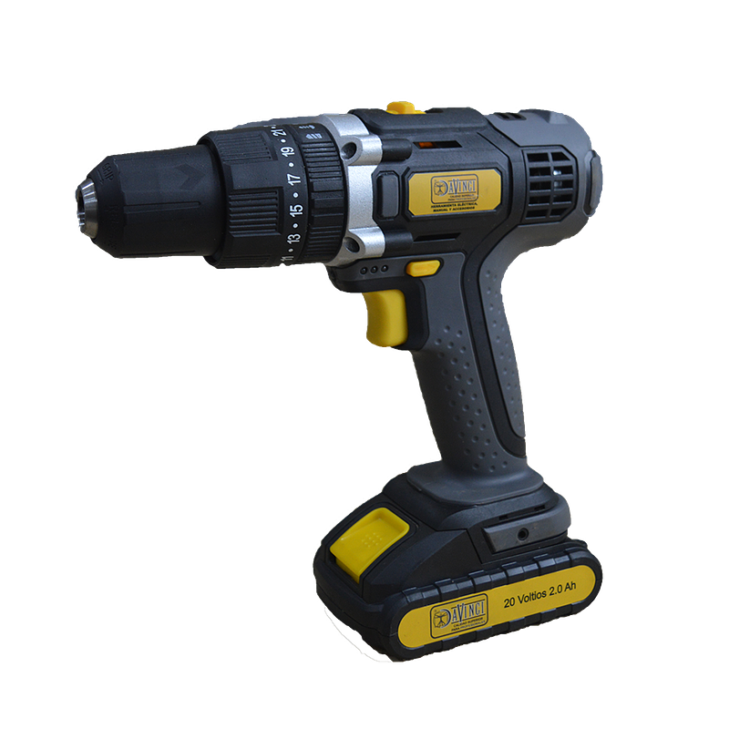 Taladro inalámbrico reversible de 1/2” y 20V, equipado con 2 baterías de 2Ah para mayor autonomía. Ideal para perforación y atornillado en madera, metal y plástico, ofreciendo practicidad, potencia y movilidad sin cables.